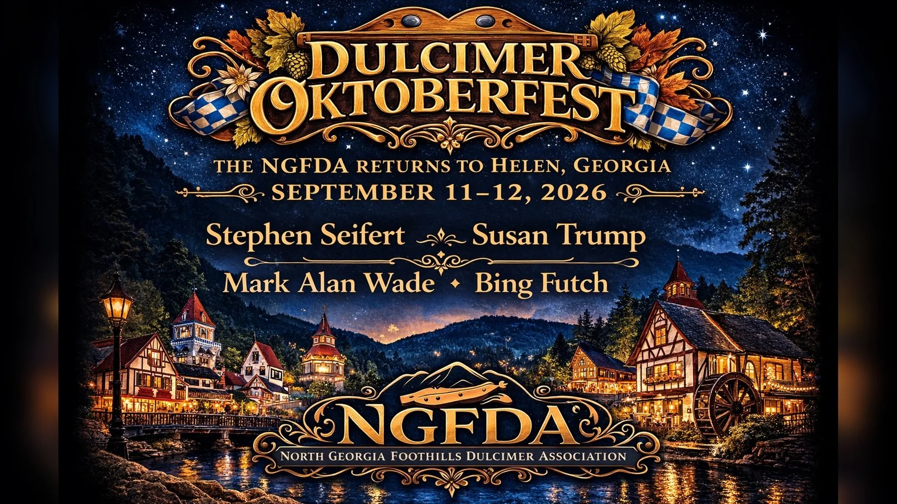 The NGFDA returns to Helen, Georgia! Dulcimer Oktoberfest takes place September 11th - 12th, 2026, at the Fairfield Inn & Suites.